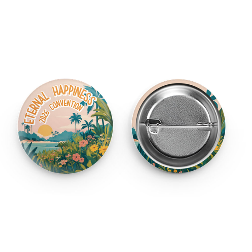 Metal pin badge with the theme for the 2026 convention "Eternal Happiness"
