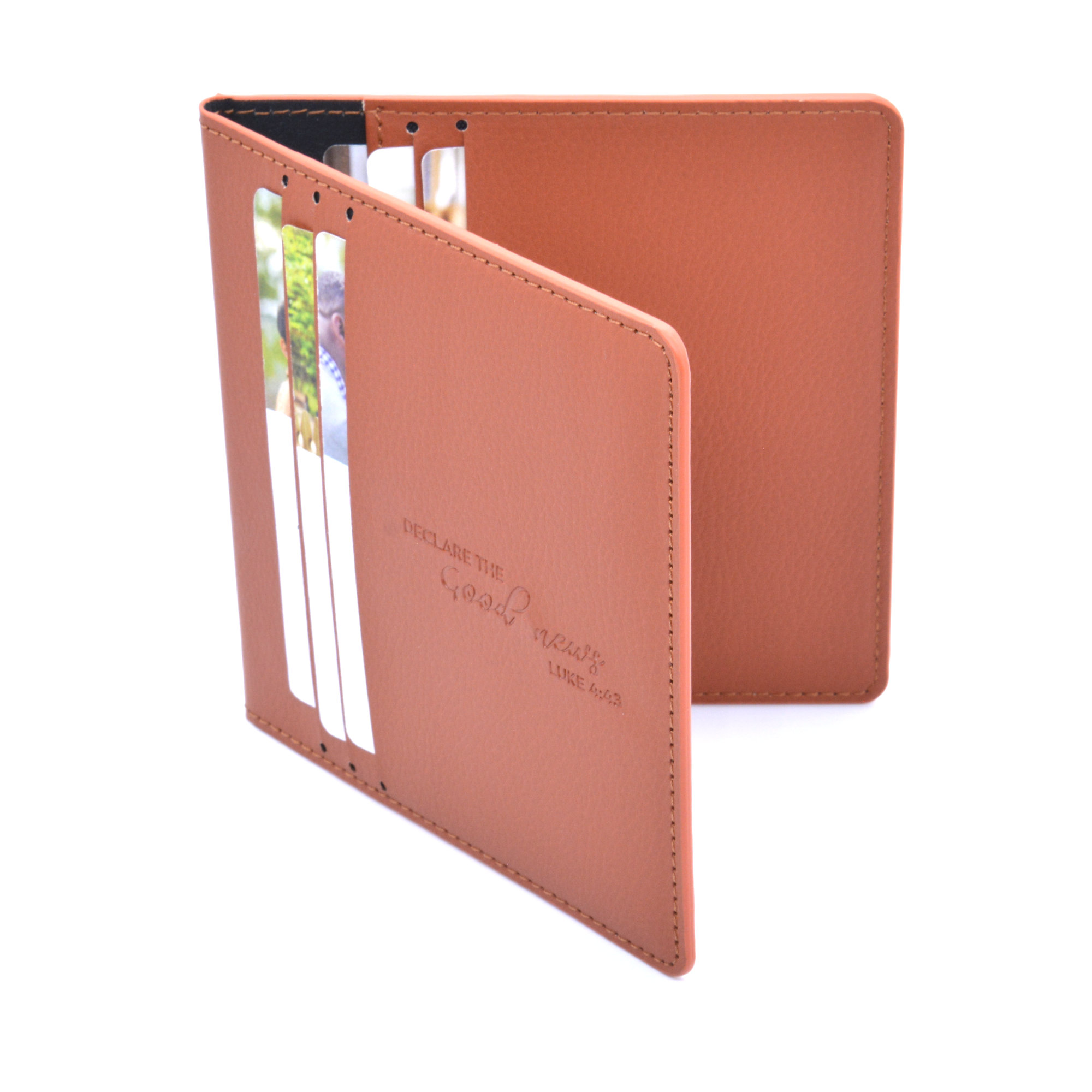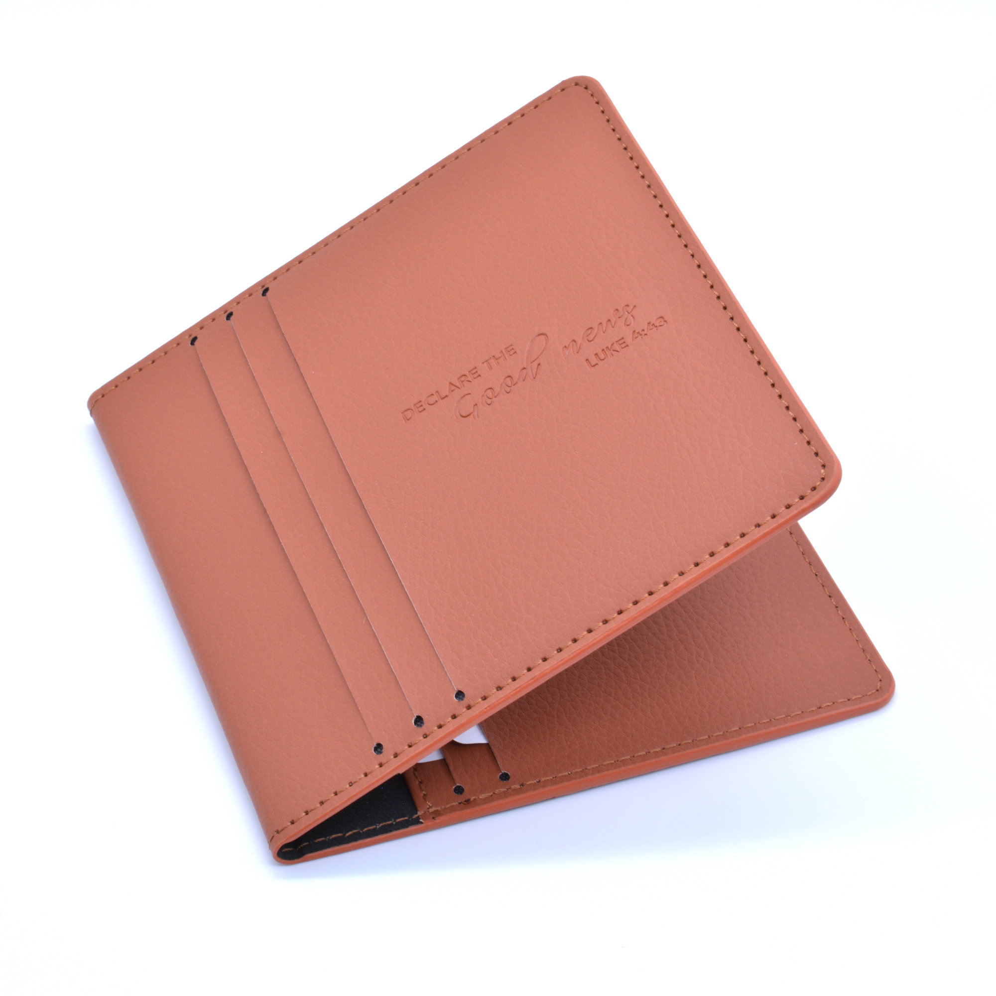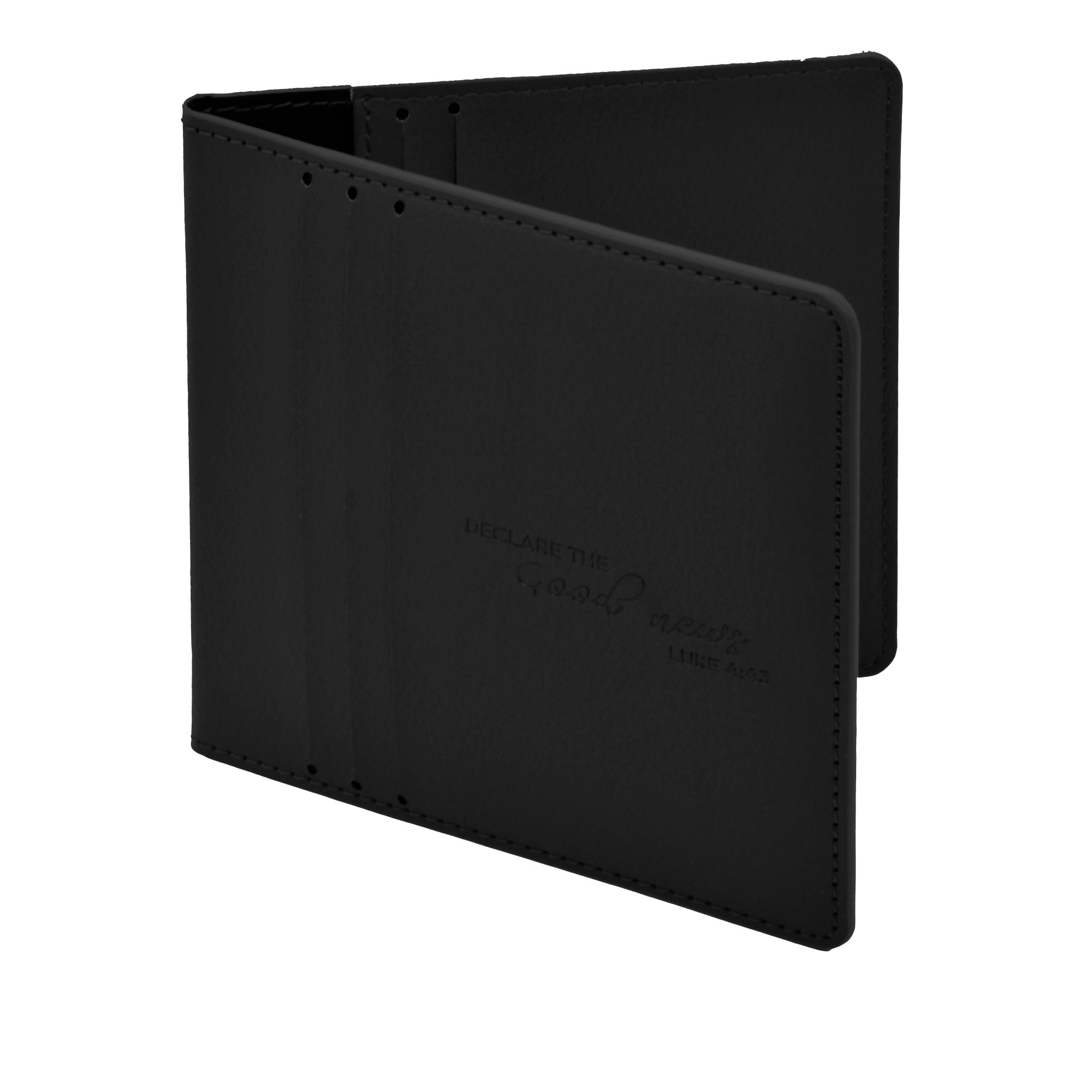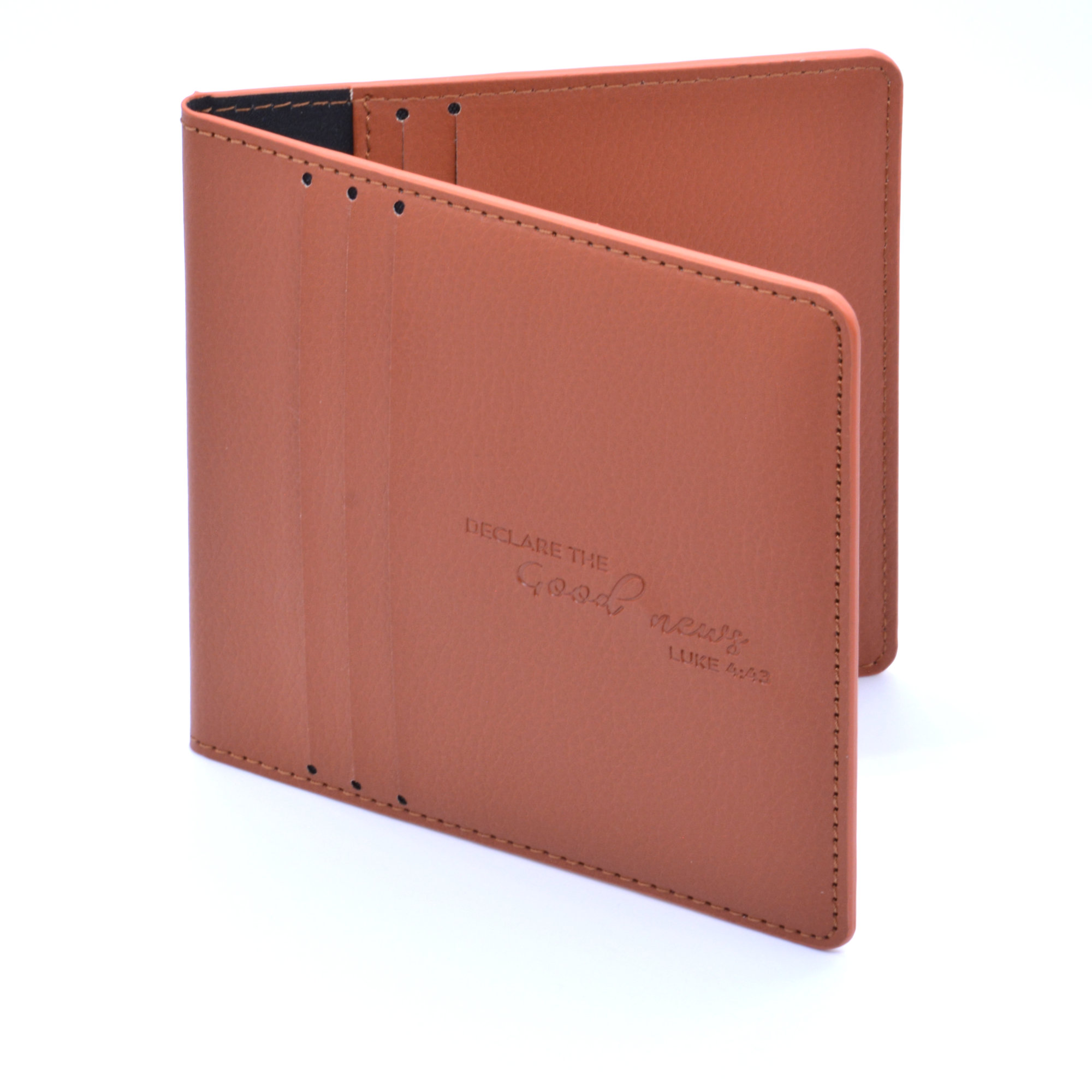 - Leather-look holder with 9 tract pockets (for the new mini tracts, 3 pockets outside, 6 inside) and 2 contact card pockets