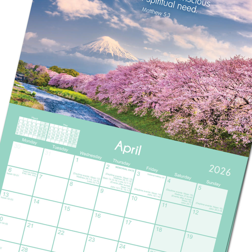 When open, each month uses a full double page spread, with the top page featuring full colour landscape images along with a scripture (YEAR TEXT THROUGHOUT), and the bottom page featuring the calendar. With full Bible Reading Schedule for the year and Memorial Bible Reading Schedule. Including national holidays, and daylight saving.